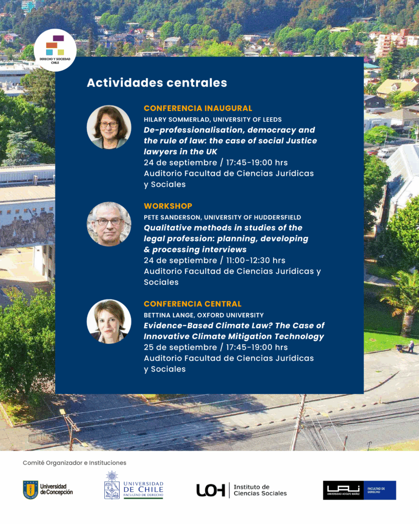 El programa del congreso destaca la conferencia inaugural De-professionalisation, democracy and the rule of law: the case of social Justice lawyers in the UK, a cargo deHilary Sommerlad, University of Leeds (24 de septiembre, 17:45, Facultad de Ciencias Jurídicas y Sociales), y la conferencia central Evidence-Based Climate Law? The Case of Innovative Climate Mitigation Technology, dictada por Bettina Lange, Oxford University (25 de septiembre, 17:45, Facultad de Ciencias Sociales), además del Workshop Qualitative methods in studies of the legal profession: planning, developing & processing interviews, a cargo de Pete Sanderson, University of Huddersfield (24 de septiembre, 11 horas, facultad de Ciencias Jurídicas y Sociales). El programa completo puede revisarse en este vínculo.