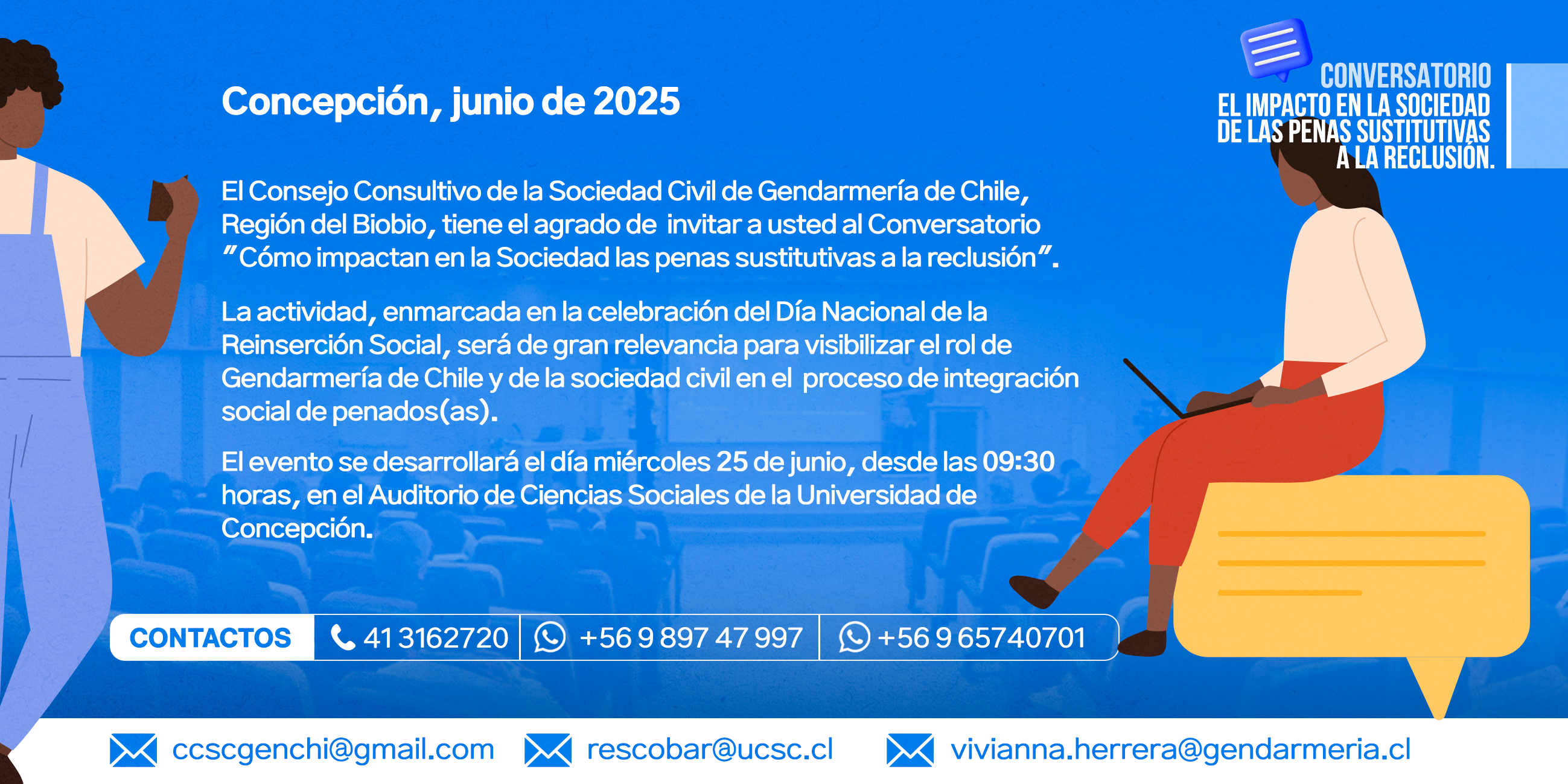 El Departamento de Psicología, con representación en el COSOC de Gendarmería de Chile, les invita al conversatorio “Cómo impactan en la Sociedad las penas sustitutivas a la reclusión”.