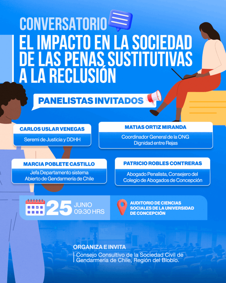 El Departamento de Psicología, con representación en el COSOC de Gendarmería de Chile, les invita al conversatorio “Cómo impactan en la Sociedad las penas sustitutivas a la reclusión”.