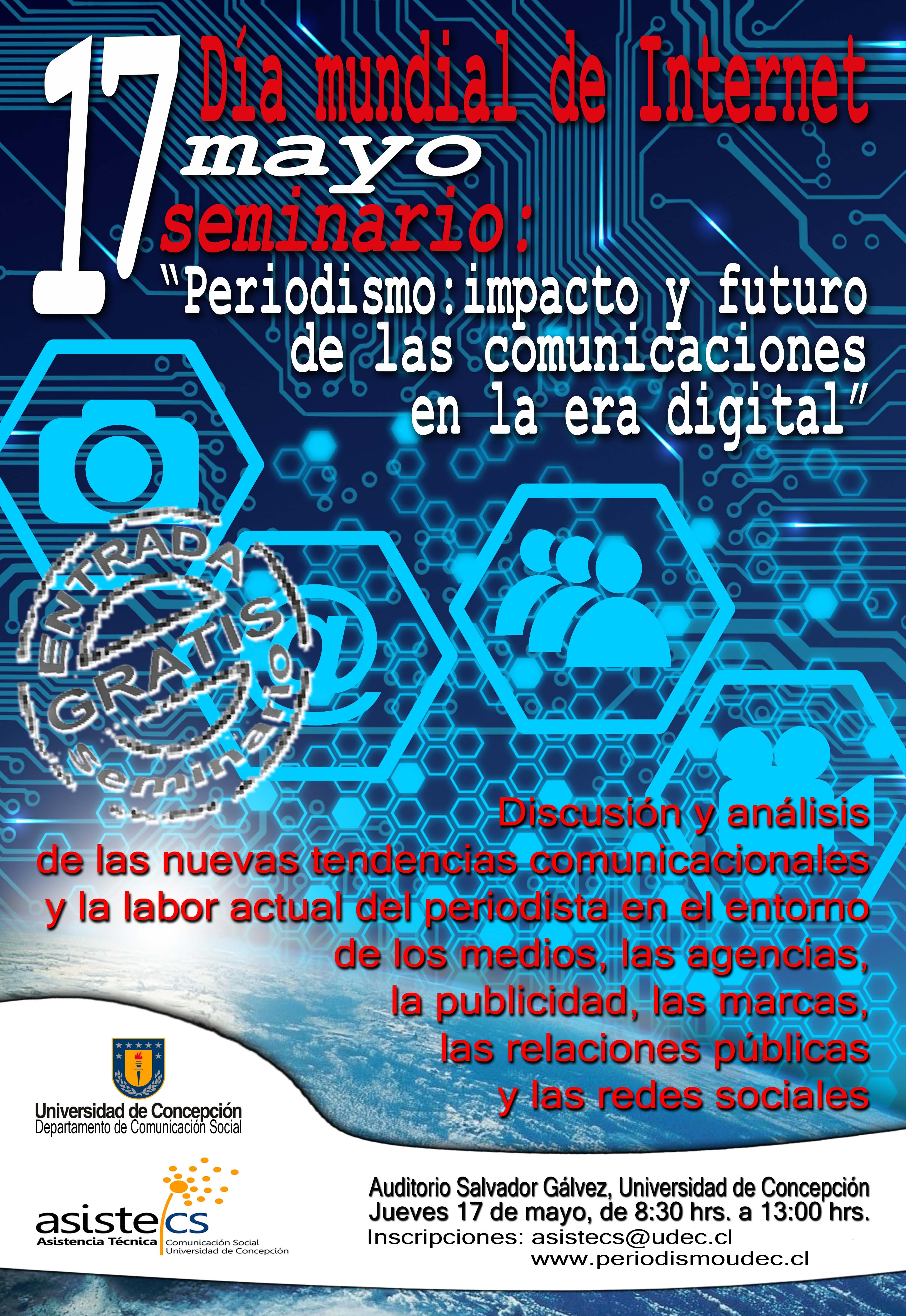 Durante el día jueves 17 de mayo, desde las 8.30 de la mañana, se desarrollará en el auditorio Salvador Gálvez de nuestra Universidad el Seminario “Periodismo: Impacto y Futuro de las Comunicaciones en la Era Digital”, organizado por el Departamento de Comunicación Social de nuestra Facultad, su Unidad de Asistencia Técnica y alumnos de la carrera. En dicha instancia se dará a conocer, desde el punto de vista de los actores que se desenvuelven en este medio, el rol que el periodista cumple en el área de las agencias, medios de comunicación, la publicidad y redes sociales.