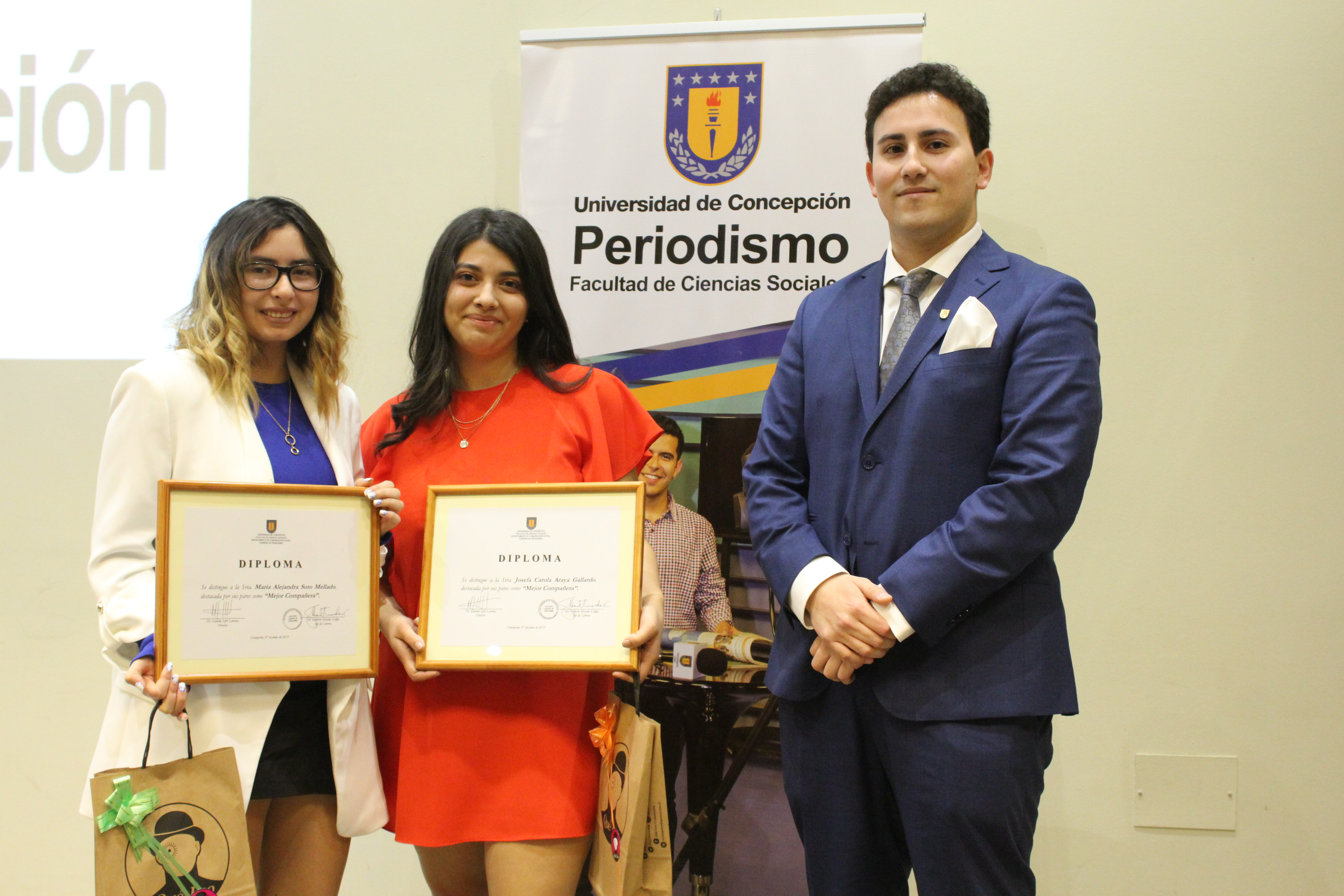 Una vez finalizada la entrega de los documentos que validan el egreso de las aulas, se distinguieron a las periodistas Macarena Sandoval, quien obtuvo el Premio Universidad de Concepción y el Premio Alumna Integral; Josefa Araya y María Alejandra Soto, quienes compartieron el Premio a la Mejor Compañera de la Promoción; y Camila Morandé, quien recibió el Premio a la Trayectoria del Consejo Regional del Colegio de Periodistas de Chile.