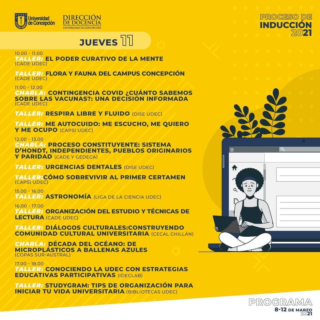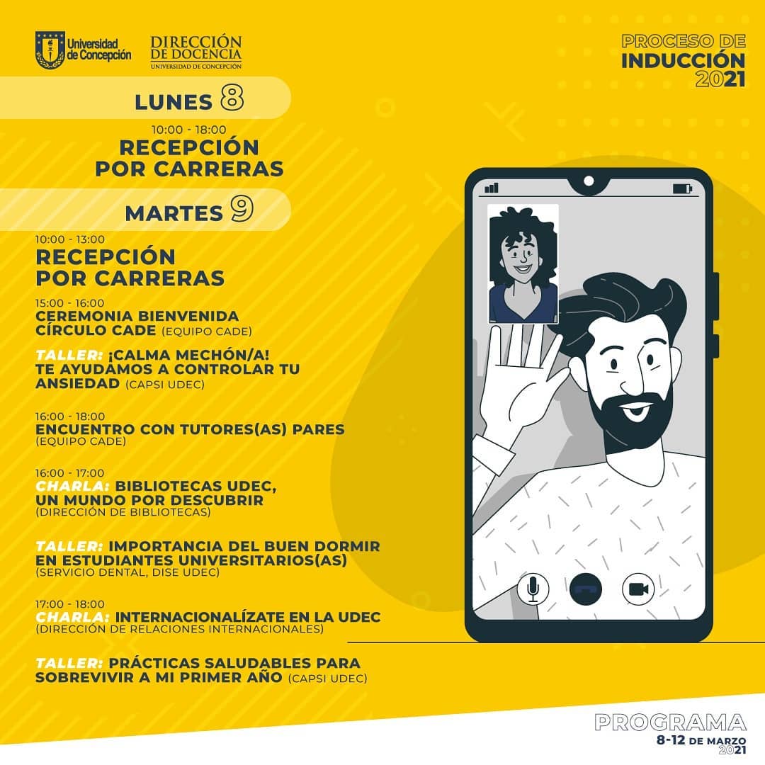 Si eres estudiante de primer año, acá hay una invitación para ti. Para darte la bienvenida y acompañar tu proceso de adaptación a la Universidad de Concepción, se realizarán cuatro días de charlas, talleres, juegos, concursos, instancias en las que podrás conocer mejor tu campus, aprender sobre cómo manejar las exigencias académicas, oír a docentes exponiendo sobre temas actuales, conocer a otros alumnos y alumnas, compartir con tus compañeros y compañeras de carrera fuera del «aula» y sentirte parte de nuestra de la UdeC.
