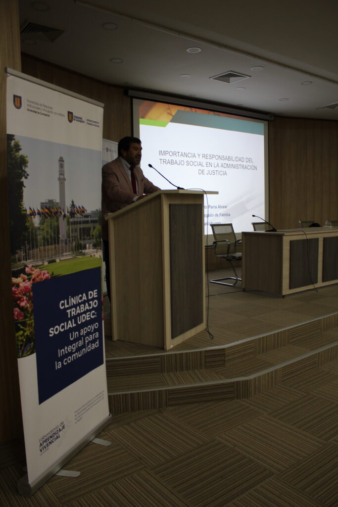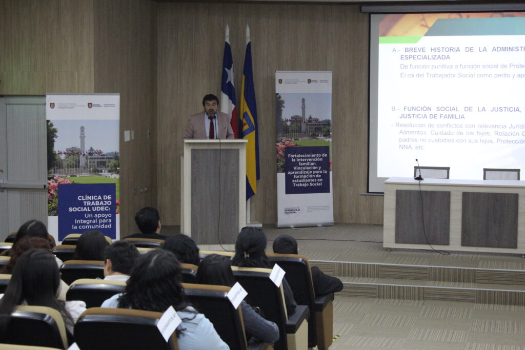 En su exposición, el magistrado subrayó la relevancia del trabajo interdisciplinario en los tribunales de familia y el papel fundamental de los y las profesionales del Trabajo Social en la protección de derechos y acompañamiento de las personas y familias que enfrentan procesos judiciales.